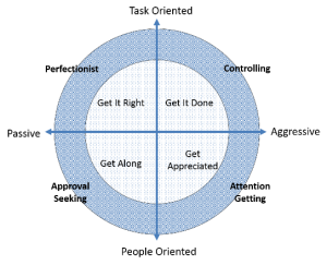 In this model, the vertical axis indicates the focus of attention – is it on the TASK or on PEOPLE. The horizontal axis indicates level of assertiveness – is it PASSIVE or AGGRESSIVE.