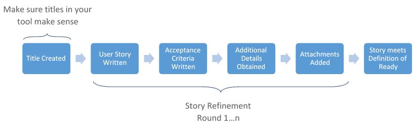 What does the process look like? To go from the initial creation of the title to a fully ready story can take any number of days. How much time and effort is spent on documenting the story depends on where it is in the stack ranked order of the backlog. I would rather not put all my effort into stories that aren’t coming up in the next 2 – 3 sprints. Even though I have hundreds of titles ready to go for months’ worth of stories.
